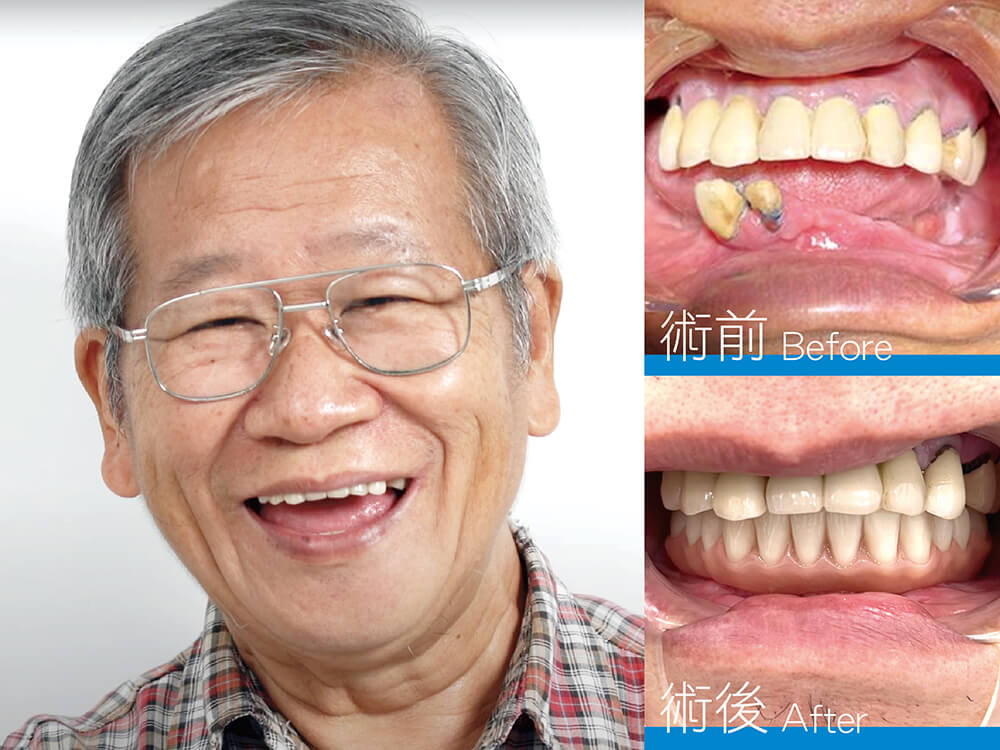 蔡伯伯還提到全口重建的牙齒穩如泰山,不像活動假牙有時講話就掉下來;術後他每逢親友聚會就問:「看看我的牙齒有沒有不一樣?」大家紛紛回饋新牙做得很漂亮,讓他非常得意。手術後,他終於真正開始享受退休人生,總算可以無後顧之憂地和太太一起吃遍美食、自在出遊!